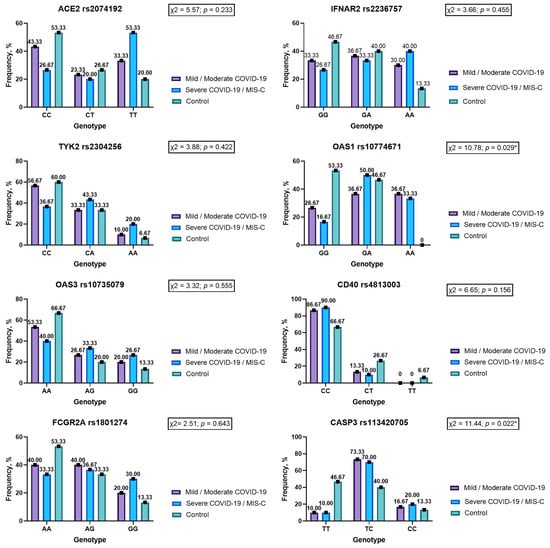 MIS-C and Kawasaki disease (KD) show similarities in their pathogenesis (autoimmune pattern), clinical course (fever, rash, no purulent conjunctivitis, cardiovascular involvement) and laboratory findings (elevated pro-inflammatory markers and evidence of coagulopathy) []. Therefore, in differential diagnosis, we assessed genome-wide significant variants associated with KD susceptibility []. Current studies suggest 63 genes associated with KD []. Among them, four groups of genes that are related to KD susceptibility were formed: (1) genes that enhance T cell activation (ITPKC, ORAI1, STIM1); (2) genes related to the dysregulation of B cell signaling (CD40, BLK, FCGR2A); (3) genes associated with decreased apoptosis (CASP3) and (4) genes related to altered transforming growth factor beta signaling (TGFB2, TGFBR2, MMP, SMAD) [,]. All listed genes have different risk allele frequencies in the European and Asian populations; therefore, we have focused on the genes that have a higher frequency in Europe—CD40 (CD40 molecule), Fc gamma receptor IIa (FCGR2A) and caspase 3 (CASP3) []. In addition, these genes are among the most important regulators of antiviral immune response []. CD40 as a costimulatory surface receptor is expressed on B-cells, macrophages, monocytes, platelets, dendritic cells and non-hematopoietic cells—vascular endothelial cells, epithelial cells, myofibroblasts and fibroblasts [,,]. Therefore, CD40 contributes to cellular and humoral immunity as well as to vascular remodeling [,,]. FCGR2A (Fc fragment of immunoglobulin G, low-affinity IIa, receptor) is also discussed in the context of immune response and vascular remodeling []. Polymorphism FCGR2A rs1801274 is associated with the substitution of histidine by arginine at position 131 (H131R) []. As a result, binding affinity with different immunoglobulins G subclasses is changed and the autoimmune response is activated []. Caspase-3 is a well-known protein involved in apoptosis and it is encoded by the CASP3 gene. The activation of caspase-3 in COVID-19 patients can be caused by the enhanced production of reactive oxygen species in the presence of oxidative stress. At the same time, the cytokine storm in SARS-CoV-2 infection is described as the result of apoptosis-related cellular death [].