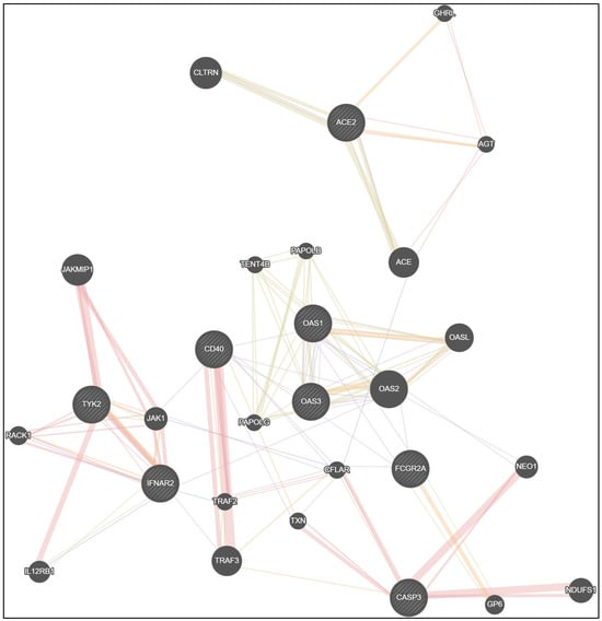 Network data from GeneMANIA [] confirm the interrelationship between the studied genes (Figure 2). It should be emphasized that in immune protection, many genes are involved. With the exception of eight studied genes (ACE2, IFNAR2, TYK2, OAS1, OAS3, CD40, CASP3, FCGR2A), we must also focus on the genes angiotensin I converting enzyme (ACE), angiotensinogen (AGT), collectrin, amino acid transport regulator (CLTRN), ghrelin and obestatin prepropeptide (GHRL), 2′-5′-oligoadenylate synthetase 2 (OAS2), 2′-5′-oligoadenylate synthetase like (OASL), poly(A) polymerase beta (PAPOLB), poly(A) polymerase gamma (PAPOLG), terminal nucleotidyltransferase 4B (TENT4B), TNF receptor associated factor 2 (TRAF2), TNF receptor associated factor 3 (TRAF3), CASP8 and FADD like apoptosis regulator (CFLAR), thioredoxin (TXN), neogenin 1 (NEO1), glycoprotein VI platelet (GP6), NADH: ubiquinone oxidoreductase core subunit S1 (NDUFS1), Janus kinase 1 (JAK1), Janus kinase and microtubule interacting protein 1 (JAKM1P1), receptor for activated C kinase 1 (RACK1) and interleukin 12 receptor subunit beta 1 (IL12RB1) (Figure 2).