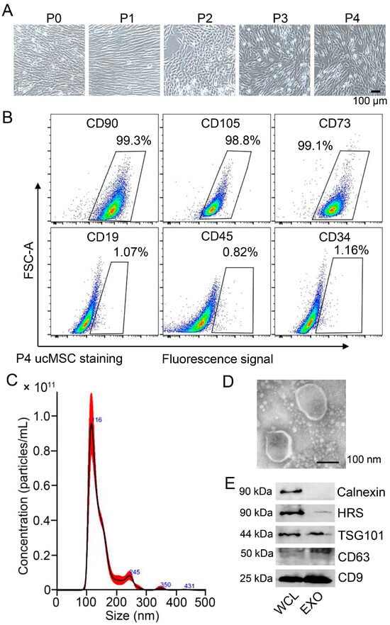 Identification and analysis of ucMSCs and ucMSC-derived exosomes. (A) Images of cultured ucMSCs from passage 0 (P0) to 4 (P4) under a light microscopy observation. Scale bar = 100 μm. (B) Flow cytometry analysis of surface antigens on cultured P4 ucMSCs. (C) NTA analysis of the isolated fractions from P4 ucMSCs supernatant. (D) Morphology of ucMSC-EXO under TEM observation. Scale bars = 100 nm. (E) Western blot analysis of positive markers (CD9, CD63, TSG101, and HRS) in exosomes. Calnexin is used as a cytosol marker. WCL, whole-cell lysis. EXO, exosomes.