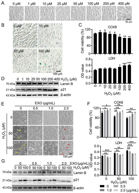 For the establishment of the premature senescence model, the HSFs were treated with 0, 10, 50, 100, 200, and 400 μM of H2O2 in serum-free high glucose DMEM at 37 °C with 5% CO2 for 1 or 2 h. The cells were then washed with the serum-free medium twice to remove the residual H2O2. In the exosome treatment group, the H2O2-treated cells were washed with the serum-free medium and incubated with the exosomes for 48 h for further assays.