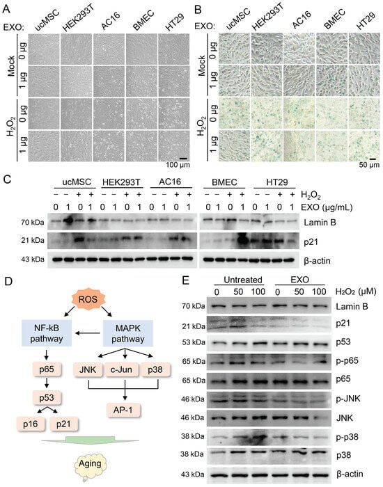 The cell-specific ucMSC-EXO inhibit the H2O2-induced NF-κB, JNK, and MAPK signaling pathways. (A–C) HSFs were pre-incubated in H2O2 (100 mM) for 2 h and then co-cultured with 1 μg/mL of exosomes derived from different kinds of cells for 48 h. Morphology of cells was observed under light microscopy. Scale bar = 100 μm (A). Cell senescence was evaluated using SA-β-Gal staining. Scale bar = 100 μm (B). The expression of lamin B1 and p21 proteins was determined using Western blotting (C). (D) The schematic diagram of ROS-mediated skin aging involved signaling pathways and downstream effectors. (E) HSFs were incubated with different concentrations of H2O2 (0, 50, and 100 mM) for 2 h and then treated with 1 μg/mL of ucMSC-EXO for 48 h. The indicated protein levels were determined using Western blotting.