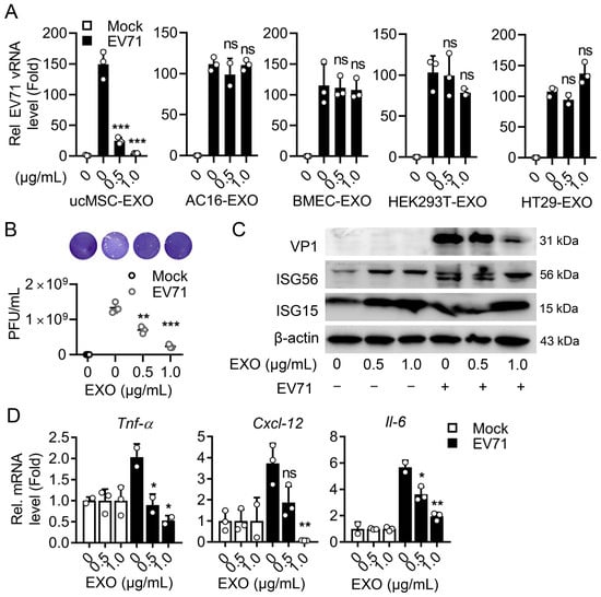 The antiviral activity of ucMSC-EXO upon EV71 infection. At 2 h p.i. with EV71 at an MOI of 0.5, RD cells were incubated with ucMSC-EXO at different doses (0, 0.5, 1.0 μg/mL) or the EXO from AC16, BMEC, 293T, and HT29 cells for another 12 h. (A) Relative expression of intracellular viral RNA levels was measured using qPCR assay. (B) The progeny virus titers in cell supernatants were determined using plaque assay in RD cells shown as PFU/mL. The representative images of the viral plaque assay were displayed. (C) Cell lysates were prepared and EV71 VP1, ISG15, ISG56, and β-actin in the cell lysates were detected using Western blot analyses. (D) Total RNA was extracted from the cells, and the RNA levels of Tnf-α, Cxcl-12, and Il-6 were determined using qPCR assay. The GAPDH mRNA was used as an internal control. Data are expressed as fold change relative to control. All data are shown as mean ± SD. ns, nonsignificant; *, p < 0.05; **, p < 0.01; ***, p < 0.001.