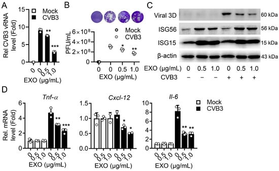 The antiviral activity of ucMSC-EXO upon CVB3 infection. At 2 h p.i. with CVB3 at an MOI of 0.5, RD cells were incubated with ucMSC-EXO at different doses (0, 0.5, 1.0 μg/mL) for another 12 h. (A) Relative expression of intracellular viral RNA level was measured using qPCR assay. (B) The progeny virus titers in cell supernatants were determined using plaque assay in RD cells shown as PFU/mL. The representative images of the viral plaque assay were displayed. (C) Cell lysates were prepared, and the viral proteins (3D), ISG15, ISG56, and β-actin in the cell lysates were detected using Western blot analyses. (D) Total RNA was extracted from the cells, and the RNA levels of Tnf-α, Cxcl-12, and Il-6 were determined using qPCR assay. The GAPDH mRNA was used as an internal control. Data are expressed as fold change relative to control. All data are shown as mean ± SD. ns, nonsignificant; *, p < 0.05; **, p < 0.01; ***, p < 0.001.