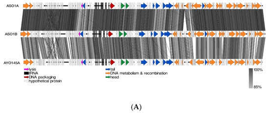 Of the four (ASO1A, ASO1B, ASO2A and ASO78A) myoviruses, the nucleotide-based intergenomic analysis showed that ASO1A and ASO1B were 97.3% similar, and both phages had 86.5–91.0% nucleotide similarity to 16 phages in the Felixounavirus (Supplementary Figure S1). CoreGenes analysis indicated that ASO1A and ASO1B shared 83.46−94.44% protein homology with proteins of 16 other members from the Felixounavirus subfamily Ounavirinae (Table S3). Of the 16 members, Salmonella phage BPS15Q2 shared more protein homology with ASO1A (94.44%) and ASO1B (93.7%) (Table S4). Based on EasyFig alignment, ASO1A and ASO1B showed a higher sequence similarity with each other than with AYO145A (Figure 4A). Sequences with putative functions such as head and tail proteins, DNA metabolism and recombination, DNA packaging and lysis proteins together with hypothetical proteins were conserved in (ASO1A and ASO1B) and phage AYO145A.