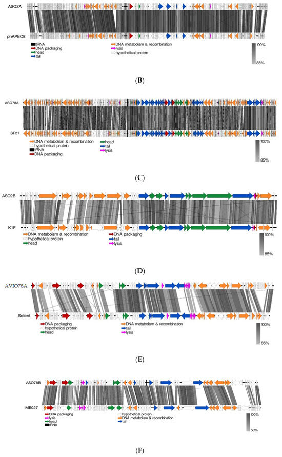 (A): Linear alignment of ASO1A, ASO1B and AYO145A genomes. (B): Linear alignment of ASO2A and phAPEC8 genomes. (C): Linear alignment of ASO78A and SF21 genomes. (D): Linear alignment of ASO2B and K1F genomes. I(E): Linear alignment of AVIO78A and Solent genomes. (F): Linear alignment of ASO78B and IME027 genomes. CDSs are represented by arrows, with arrow colour corresponding to predicted CDS function, and grey bands represent sequence similarity between genomic regions.