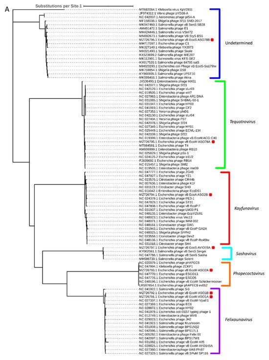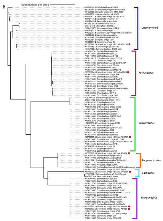 Aligned phage genomes were annotated using Snakemake [31] and Prokka [32] for putative open reading frame (ORF) and protein prediction. Predicted ORFs were compared locally to viral and bacterial proteins from the NCBI RefSeq database [33]. Putative transfer RNA genes (tRNA genes) were predicted by Prokka [32] using Aragorn [34] and then additionally by tRNAscan-SE (at http://lowelab.ucsc.edu/tRNAscan-SE/, accessed on 20 August 2023) [35] using Infernal [36]. Regulatory regions such as Rho-independent terminators were predicted using a combination of TransTermHP v2.08 [37], WebGeSTer [38] and bTSSfinder [39]. The presence of E. coli σ70 promoter regions was determined by locating promoter motifs in reference phages and scanning isolated phages for the presence of these motifs. The presence of antimicrobial resistant genes (ARGs) and virulence genes was determined by scanning predicted ORF nucleotide sequences using Abricate version 0.8.7 at https://github.com/tseemann/ABRICATE, accessed on 20 August 2023 [40], with the following datasets: NCBI AMRFinderPlus [41], ARG-ANNOT [42], Virulence Factor Database (VFDB) [43] and ResFinder [44]. Peptide transmembrane regions were described using TMHMM [45], and SignalP 5.0 was used to discover signal peptides [46]. Predicted proteins were compared against the prokaryotic virus orthologous groups (pVOG) database [47] with HMMER3 [48] hmmsearch. Predicted protein sequences were queried against the NCBI nr database with BLASTP [49], and all annotations were then manually assessed to improve the number of proteins with assigned putative functions based on homology with reference phages in the NCBI database. All code is available online at http://github.com/jaredmychal/phageAnnote, accessed on 20 August 2023. The annotated genomic sequences have been deposited in GenBank under the accession numbers ASO1A (MZ726791), ASO1B (MZ726792), ASO2A (MZ726793), ASO78A (MZ726795), ASO2B (MZ726794), ASO78B (MZ726796), and AVIO78A (MZ726797).