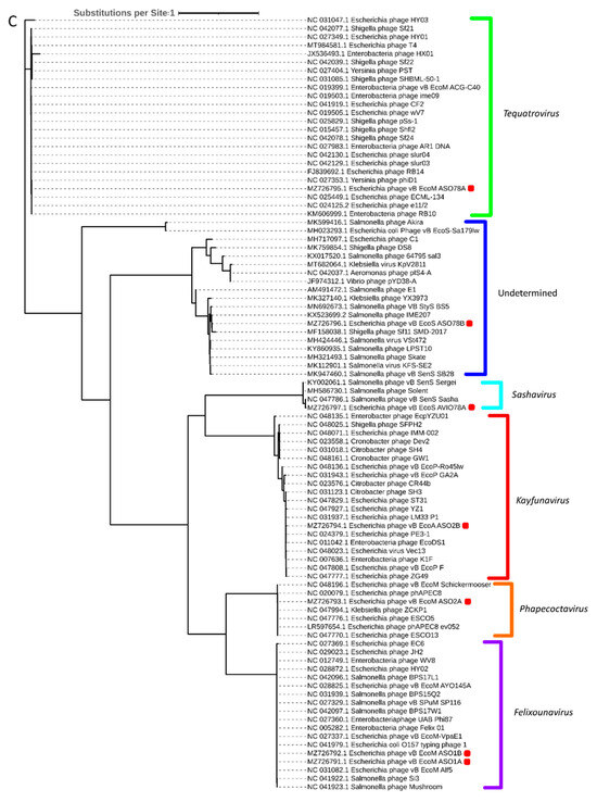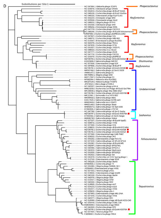 Phylogenetic analysis based on capsid, portal and the large subunit of terminase protein sequences grouped six of the seven APEC-infecting phages within their predicted genus (Figure 5A–C). Phage ASO78B clustered with phage IME207, a Shuimuvirus (Figure 5A–C). The inferred phylogenetic tree of tail fiber protein sequences showed distinct branches within each genus (Figure 5D). Tail proteins of ASO2A and ASO2B, Phapecoctavirus and Kayfunavirus, respectively, clustered together compared to other phages which clustered within their respective genera (Figure 5D). Although ASO78B is more closely related to IME207, a Shuimuvirus, with a nucleotide similarity of 62.7%, its tail protein is distantly related to that of IME207. Rather, the IME207 tail protein clustered with Phapecoctavirus and Kayfunavirus (Figure 5D).