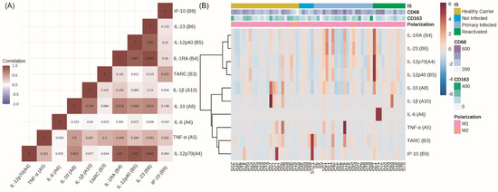 (A) Correlation matrix of peripheral cytokines. Numbers inside the box represent the Spearman correlation coefficient (r). The color within each box indicates the value of r, the red color indicates values between 0 and 1 (positive correlation), and the blue color indicates values between 0 and −1 (negative correlation), while the intensity of the color increases as r increases towards values close to |1|. (B) Heat map of peripheral cytokine expression (color scale) arranged by infectious status (IS); polarization markers (CD68 and CD163) and polarization profiles (M1 and M2) data are shown at the top. Both graphs show two clusters of cytokines with distinct behaviors. One cluster is compounded by IL-12p40, IL-12p70, IL-23, and, unexpectedly, IL-1RA. On the other hand, the second cluster can be further subdivided into two groups: IL-10 and IL-1β, and IL-6, TNF-α, CCL17 (TARC), and IP-10.