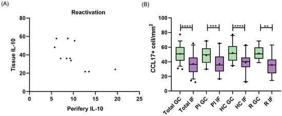 (A) Correlation between tissue and peripheral IL-10 expression in reactivated patients. (B) Histological distribution of CCL17. Total expression in the germinal center (GC) and interfollicular region (IF) in the entire cohort in primary infected patients (PI), healthy carriers (HC), and patients undergoing reactivation (R). The cross inside the box represent the mean, the line crossing the box represent the median, and error bars indicate the standard deviation. ** p < 0.01, *** p < 0.001, **** p < 0.0001.