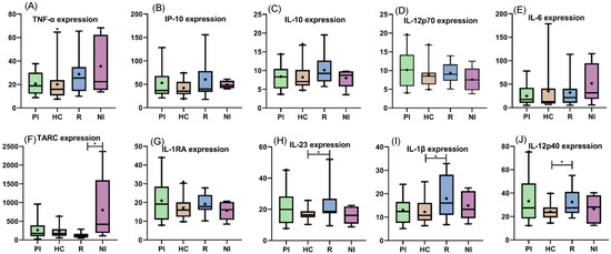 Peripheral cytokine expression among infectious statuses. (A) TNF-α. (B) IP-10. (C) IL-10. (D) IL-12p70. (E) IL-6. (F) TARC. (G) IL-1RA. (H) IL-23. (I) IL-1β. (J) IL-12p40. The cross inside the box represents the mean, the line crossing the box represents the median, and error bars indicate the standard deviation; * p < 0.05.