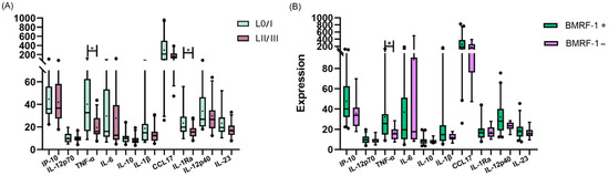 (A) Peripheral cytokine expressions in patients expressing Latency 0 and I antigens (L0/I) and Latency (II/III) antigens (LII/III). (B) Comparison of peripheral cytokine expressions between patients who were BMRF1+ and BMRF1−. The cross inside the box represents the mean, the line crossing the box represents the median, and error bars indicate the standard deviation. * p < 0.05.