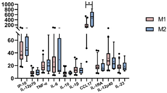 Peripheral cytokine expression in patients with the prevalence of M1 or M2 polarization profiles in tonsils. The cross inside the box represents the mean, the line crossing the box represents the median, and error bars indicate the standard deviation. * p < 0.05.