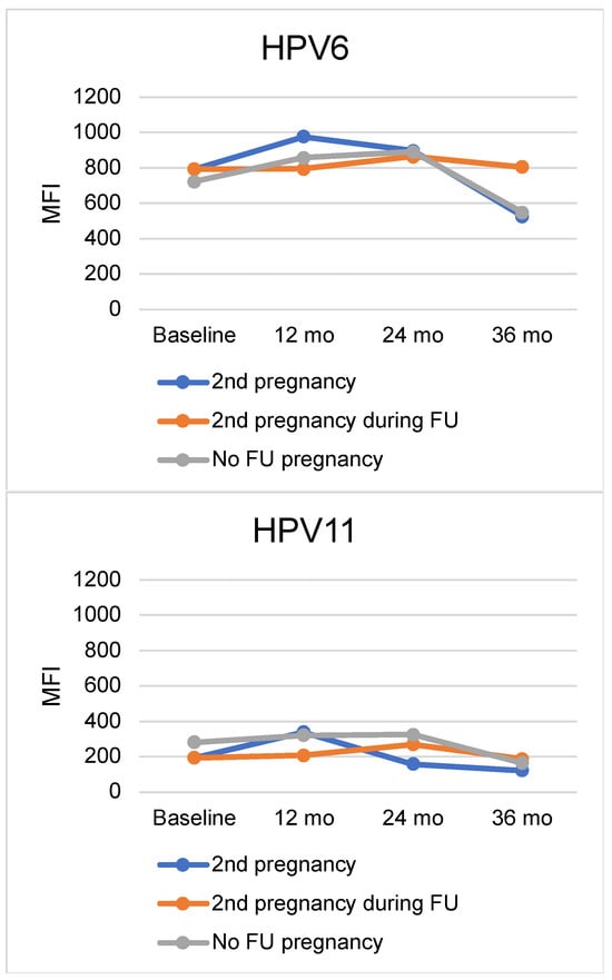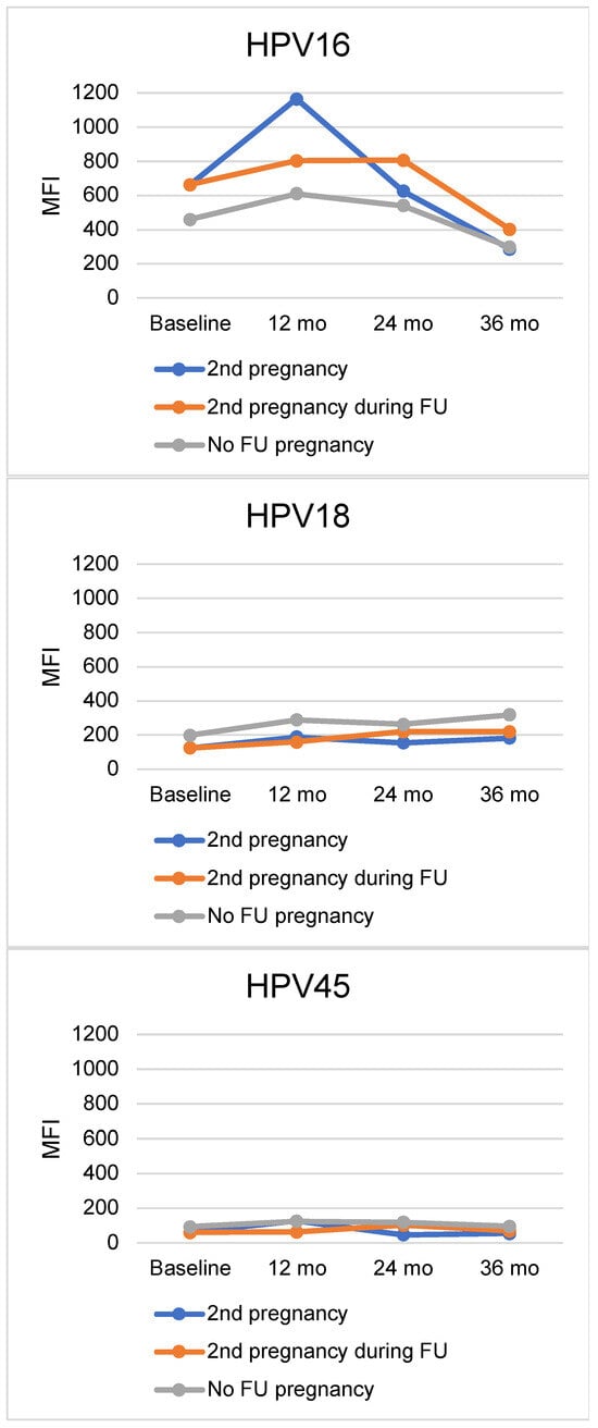 Mean MFI levels of HPV6, HPV11, HPV16, HPV18, and HPV45 antibodies at baseline and at the 12-month, 24-month, and 36-month followup visits among seropositive women stratified by the status of their second pregnancy. The blue line depicts the mean MFI values of those who had a second pregnancy at each specific followup timepoint, the orange line depicts those who had a second pregnancy at some other timepoint during the followup time, and the gray line depicts those who did not have a second pregnancy at all. Abbreviations: MFI = median fluorescence intensity, mo = months, FU = follow-up.