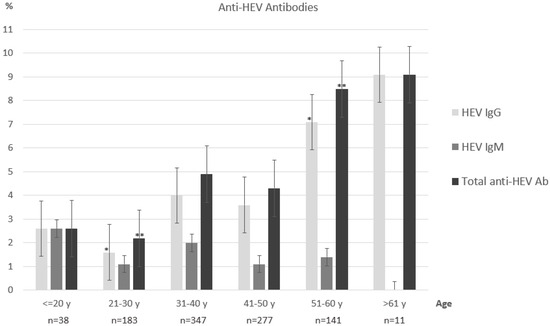 Anti-HEV antibodies in different age groups. Statistically significant differences are marked with asterisks (* p = 0.029; ** p = 0.019).