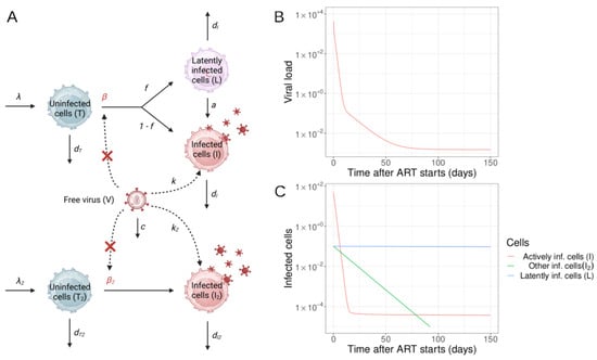 Schematic of a viral dynamics model involving multiple populations of infected cells. (A) A flow diagram between two populations of uninfected cells (T, T), virus infected cells (I, I), a latently infected cell population (L) and free HIV-1 (V) according to the ODE shown in Equation (4). Red X’es indicate the complete interruption of viral infection during fully effective therapy. (B) The decay of the viral load in multiple stages is shown. (C) The decay of distinct host-cell populations, as predicted by the model, are depicted. Time-series were integrated using JSim v2.21 with standard integration parameters [32]. (Figure adapted from Hill [18] and created by part (A) with BioRender.com).