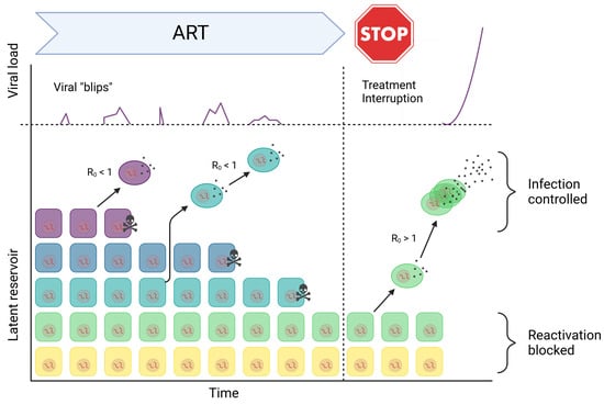 Following the recognition of the persistence of latent HIV-1 and residual plasma viremia despite highly suppressive therapy, researchers have sought to understand the underlying mechanisms (Figure 3). Two main hypotheses have emerged in this regard. The first hypothesis suggests that latent infection is maintained by mechanisms similar to immunologic memory. According to this theory, the occasional reactivation of latent cells leads to the production of new virus particles, resulting in residual viremia. This hypothesis implies that the reservoir of latently infected cells serves as a long-term source of viral production. The second hypothesis proposes that ART is not completely effective in halting viral replication, indicated by an effective reproduction number () greater than 1 (see also Section 1 and Equation (2)). In this scenario, continual rounds of infection can lead to persistent viremia or persistent latent infection, or even both concurrently [66,67]. This hypothesis suggests that despite the suppression of viral replication by ART, ongoing low-level replication may contribute to the maintenance of viral reservoirs and residual viremia [68,69]. However, the topic of ongoing viral replication under ART is still up for debate, because careful analyses of viral evolution in patients on ART appear incompatible with ongoing replication during ART [70].