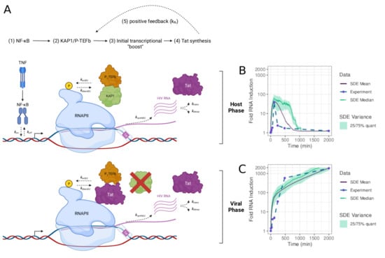 During productive infections with wild-type proviruses, the initial transcriptional boost is critical because it enables Tat synthesis before the host phase turns off. In this case, the host phase is rapidly followed by a “viral” phase in which Tat amplifies transcription by more than 100-fold, promoting a positive transcriptional feedback loop and robust viral replication (Figure 4). Considering all three phases of HIV-1 transcription, Morton et al. investigated the roles of host cell factors, the immune cell stimulation on the host phase and its effect on the positive feedback loop [121]. In particular, Morton et al. focused on the dynamics of the non-basal expression depending on activation by NF-B, the host transcriptional regulator KAP1 (TRIM28, TIF1) and Tat