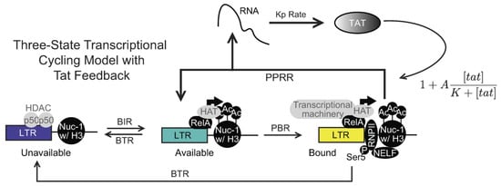The model describes two possible scenarios [107]. In the first scenario, the promoter continuously cycles between the AP and BP states, resulting in bursts of transcription. Hence, the model is referred to as a transcriptional cycling model. In the second scenario, the BP state transitions back to the UP state, indicating a burst termination event. The BTR for this transition is assumed to be the same as the BTR for the AP state to UP state transition, as the biological processes governing these transitions, such as TF removal and chromatin remodeling, are similar to each other and distinct from the processes governing the other transition rates. Bullock et al. [109] expanded the original model by Bartman et al. [107] and included a Tat-mediated positive feedback to the transcriptional cycling model by amplifying PPRR with a Tat-dependent term (Figure 5) as shown