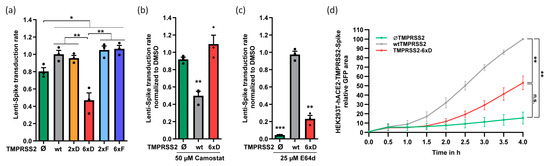 In SARS-CoV-2-infected cells, cytopathic syncytia formation occurs due to the membrane fusion of cells expressing Spike and cells expressing hACE2, a process that is further accelerated by the co-expression of TMPRSS2 [11,15,22]. Cell-cell fusion rate, as measured using the bimolecular fluorescence complementation (BiFC) approach [22], was lower in TMPRSS2-6xD compared with wtTMPRSS2 cells (Figure 2d). However, it was significantly higher compared to TMPRSS2-negative cells, possibly because TMPRSS2-6xD maintained a low level of enzymatic activity. These results suggest that TMPRSS2-6xD poorly supports SARS-CoV-2 membrane fusion and membrane fusion entry.