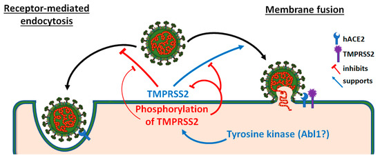 The authenticity of endogenous Abl1 as the genuine TMPRSS2 kinase is currently uncertain, given that our study relied on the over-expression of an overactive Δ81Abl1 mutant. The definitive identification of the genuine tyrosine kinase responsible for TMPRSS2 phosphorylation remains a topic for future investigations. In our prior study [22], we documented the reduction in SARS-CoV-2 infection with the use of imatinib in an Abl1/Abl2-independent process. In this study, we demonstrate that imatinib effectively inhibits Abl1-mediated hyperphosphorylation of TMPRSS2, suggesting an enhancement in SARS-CoV-2 infection control. However, it is worth noting that imatinib’s inhibitory effect primarily occurs at the level of Spike protein by direct imatinib-Spike interaction [22], which is an upstream process. This overrides the significance of TMPRSS2 phosphorylation in the context of SARS-CoV-2 infection.
