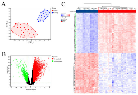 Limma (Linear Models for Microarray Data) is a differential expression screening method based on generalized linear models. In this study, we used the limma package (version 3.40.6) in R software for differential analysis [20]. The differentially expressed genes (DEGs) between the acute phase sample cohort and the non-infected healthy group were analyzed. The resulting expression profile dataset was first subjected to multiple linear regression using the lmFit function. Then, the eBays function was used to calculate the reduction of statistics, applying log-odds differential expression of the empirical Bayes moderation to the common value standard error, and finally determining the differential significance of each gene. In this analysis, we used FDR 2.0 to generate a DEG volcano map, displaying the top 100 genes through a heat map (top 50 up-regulated and top 50 down-regulated).