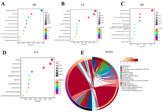 Functional Enrichment Analysis of DEGs. (A) GO enrichment results of DEGs in Biological Processes (BP). (B) GO enrichment results of DEGs in Cellular Component (CC). (C) GO enrichment results of DEGs in Molecular Function (MF). (D) GO enrichment results of DEGs overall. (E) KEGG enrichment results of DEGs.