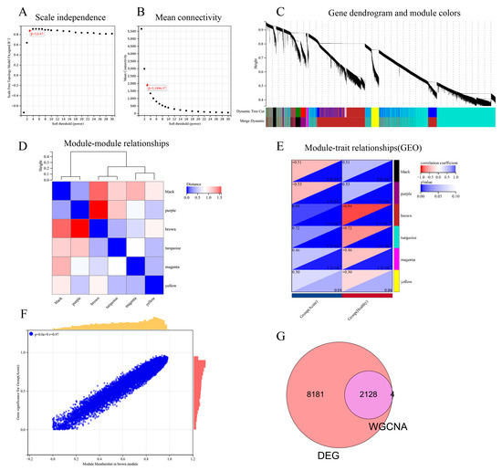 WGCNA module analysis of the GSE144358 dataset and identification of candidate key genes. (A) Soft threshold power results of WGCNA. (B) Average connectivity results of WGCNA. (C) WGCNA clustering tree results. (D) Correlation analysis results between WGCNA clustering modules. (E) Correlation analysis results between WGCNA clustering module and differential grouping. (F) Results of correlation analysis between module membership in brown module and gene significance for Group (Acute). (G) Intersection gene results of DEGs and genes in brown module.