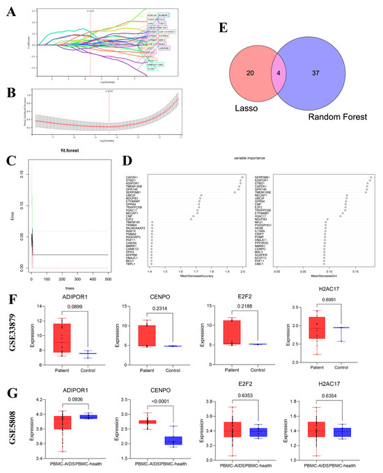 The figure shows the process of obtaining characteristic genes using a machine learning algorithm. (A) The LASSO–Cox regression model is used to screen for characteristic genes. (B) A fixed lambda value is determined by cross-validation. (C) The error rate confidence interval of the random forest model. (D) The candidate feature genes are recommended by the random forest algorithm. (E) The intersection results of the candidate feature genes obtained by the LASSO–Cox and random forest algorithms. (F) The expression of four characteristic genes in patients and health control groups in AIDS. (G) The expression of four feature genes in patients and health control groups in Acute measles.