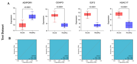 In addition, the diagnostic efficiency of the validation set cohort for predicting the SFTSV acute phase with each characteristic gene was consistent with the results of the test set. As shown in Figure 7A, there were significant differences in the expression levels of ADIPOR1, CENPO, E2F2 and H2AC17 in the samples between the acute phase group and the healthy group (Figure 7A), and the results in the ROC curve corresponding to their respective characteristic genes were also consistent with the results of the test set (Figure 7B).