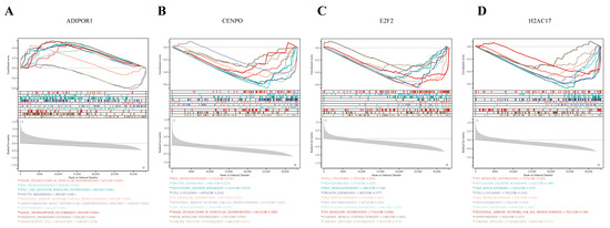 GSEA results of 4 characteristic genes. ADIPOR1 (A), CENPO (B), E2F2 (C) and H2AC17 (D) was identified as characteristic genes.