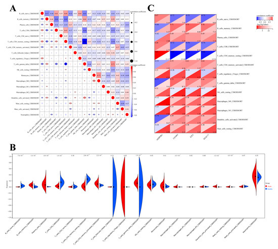 Correlation analysis of immune cell infiltration and 4 characteristic genes. (A) The results of different immune cell infiltration. * means p < 0.05, ** means p < 0.01, *** means p < 0.001, **** means p < 0.0001. (B) Differential expression of cells infiltrated by different immune cells. (C) Correlation analysis of immune cell infiltration and 4 characteristic genes.