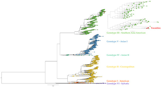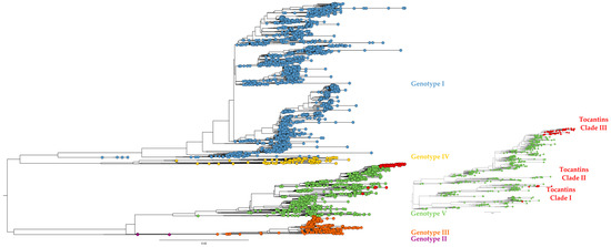 All 57 DENV-1 genome sequences belonged to genotype V (Figure 2). Additionally, the DENV-1 genomes from Tocantins were observed to group into three distinct clades. Similarly, the four DENV-2 genomes recovered here clustered within genotype III, the so-called Southern Asian–American clade (Figure 3).