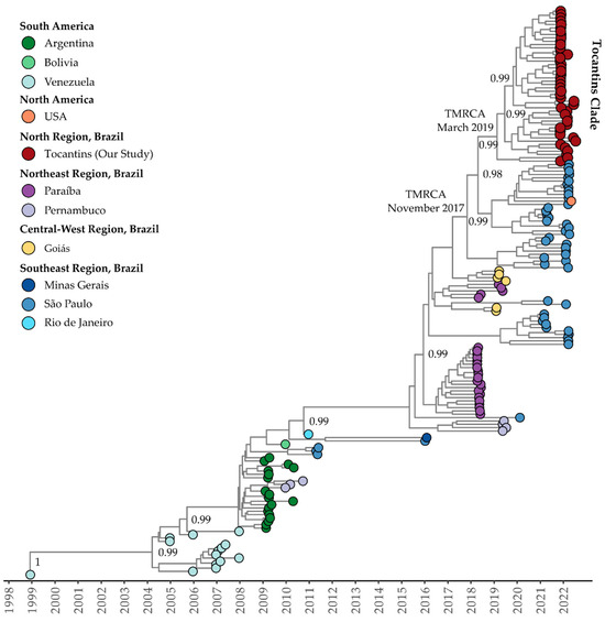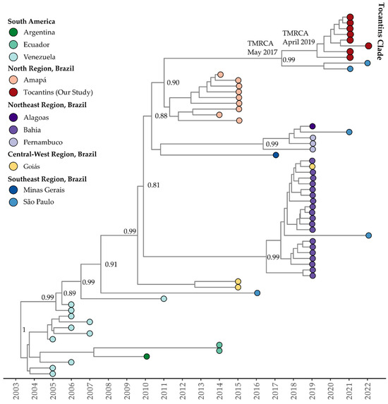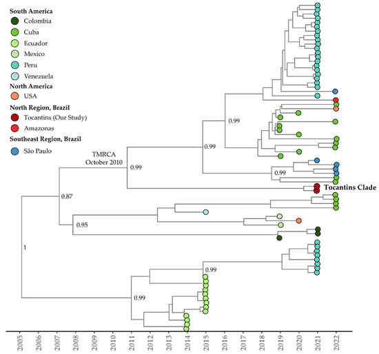 The mean evolutionary rate estimated for clade I (or clade Americas, as proposed by Fritsch et al., 2023 [47]) of DENV-1 genotype V was 7.85 × 10−4 substitutions per site per year (95% highest posterior density interval: 5.96 × 10−4 to 8.63 × 10−4). The time of the most recent common ancestor (TMRCA) was estimated to be 20 December 2004 (95% HDP: 12 October 2001, to 15 October 2007). According to the Bayesian phylogeny, the genomes within clade I from the Tocantins state formed a single subclade with strong support (posterior probability = 0.99). This subclade was part of a larger cluster that included sequences from São Paulo, Amazonas, Peru, and Cuba, plus a genome sequence from the USA, isolated from a patient who had traveled to Cuba (OQ445881). The estimated TMRCA for this cluster was 28 October 2010 (95% HDP: 15 September 2007, to 1 November 2018), while for the Tocantins subclade, it was determined to be 12 April 2019 (95% HDP: 18 January 2018, to 22 June 2013) (Figure 4).