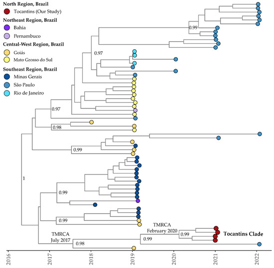 Clade II (or clade III according to Fritsch et al., 2023 [47]) of DENV-1 genotype V exhibited a mean evolutionary rate of 9.18 × 10−4 substitutions per site per year (95% HDP: 7.55 × 10−4 to 1.09 × 10−3). The TMRCA for this clade was estimated to be 22 January 2003 (95% HDP: 12 August 2001, to 20 May 2004). The Bayesian phylogeny revealed a close relationship between clade II isolates recovered in the sates of Tocantins and São Paulo (ON426305 and ON632048) (Figure 5). The estimated TMRCA for clade II was 16 May 2017 (95% HDP: 18 September 2014, to 1 November 2018), while the Tocantins subclade’s TMRCA was estimated to be 12 April 2019 (95% HDP: 18 January 2018, to 13 January 2020) (Figure 5). The Bayesian stochastic search variable selection (BSSVS) procedure detected supported rates of diffusion from the São Paulo state to Tocantins with a Bayes Factor of 17.6 and a posterior probability of 0.65.