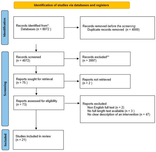 - Page, M.J.; Moher, D.; Bossuyt, P.M.; Boutron, I.; Hoffmann, T.C.; Mulrow, C.D.; Shamseer, L.; Tetzlaff, J.M.; Akl, E.A.; Brennan, S.E.; et al. PRISMA 2020 Explanation and Elaboration: Updated Guidance and Exemplars for Reporting Systematic Reviews. BMJ 2021, 372, n160. [Google Scholar] [CrossRef]