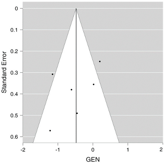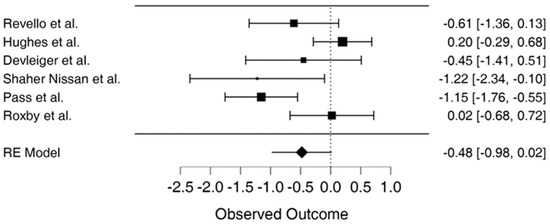 Utilizing the random effects model REML approach, the estimate of effect size (d = −0.479, 95% CI = −0.977–0.019, p = 0.060) suggests the results are not statistically significant, as shown in Table 3. Meta-analysis results suggested that overall conclusions based on the review of RCTs were not statistically significant. Two RCTs were outside the 95% confidence interval, suggesting that the results were not reliable for these studies, while the remaining 4 studies showed conflicting evidence. In addition, two studies suggested that the treatment group reported better CMV prevention and detection, while studies to the right of the effect line suggested that the outcome of interest occurred more frequently in the treatment or the control group.