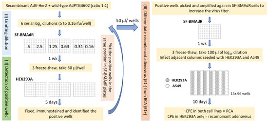 Workflow for rescuing recombinant adenoviruses from stock highly contaminated with RCA via limiting dilution and characterization of AdV clones. This protocol consists of three steps. (I) Limiting dilution step in which 48 wells were infected with 6 serial log2 dilutions (5 to 0.16 ifu) per well of the AdV/RCA mixed stock. (II) Detection step in which positive wells were identified by immunostaining using HEK293A cells. (III) Differentiation step in which, after one additional round of clone amplification in SF-BMAdR cells, each clone infects HEK293A and A549 cells in parallel to differentiate whether they are rAdV or RCA.
