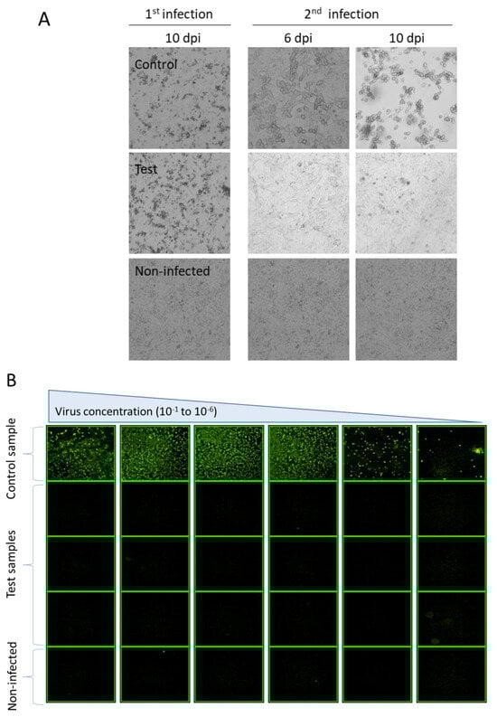 As the acceptable limit of RCA in biological material, in general, is extremely low, it is not possible to show the clonality and effectiveness of our limiting dilution method for isolating the AdV from RCA without artificially increasing the initial amounts of RCA in the test sample. Thus, an artificial AdV viral stock containing high amounts of wild-type adenovirus was generated to demonstrate the efficacy of our limiting dilution. The AdV:Her2 (as the surrogate for first-generation AdV), with wild-type adenovirus (as the surrogate for RCA) had a 1:1 ratio (Figure 1). Three 96-well plates were seeded with 30,000 SF-BMAdR cells in 50 μL/well. A total of 6 log2 dilutions of mixed viruses starting with 5 infectious units (ifu) to 0.16 ifu/50 μL was prepared. Immediately, 48 wells were infected with 50 μL of each log2 dilution of the mixed viruses. After 1 week of incubation, the plates underwent three rounds of freeze–thaw cycles. In the next step, the HEK293A cells were used to differentiate the infected wells from noninfected wells. Three plates of 96-well plates were seeded with 15,000 HEK293A cells/well and, the day after, plates were infected with 50 μL of the supernatant of infected SF-BMAdR cells. Each well on the infected plate of HEK293A corresponds to the same position/clone on the infected SF-BMAdR plates. Five days post-infection (p.i.), cells were fixed with methanol, and the presence of adenovirus fiber in infected cells was confirmed by immunostaining via a protocol described previously [24]. Briefly, 100% methanol was used as a fixing agent. PBS + 2% FBS was used as a washing and blocking reagent, as well as a diluent for the monoclonal antibodies used during immunostaining, and conjugated. The plates were washed three times between each step of the immunostaining. The fixed cells were blocked for 60 min, and incubated for 2 h with an in-house monoclonal antibody against adenovirus fiber (2G11-2) at a concentration of 1 µg/mL. Next, the samples were washed and incubated for 1 h at room temperature with a secondary antibody, which is a fluorescein isothiocyanate (FITC) conjugated anti-mouse antibody (Fluorescein-AffiniPure F(ab’)2 Fragment Goat Anti-Mouse IgG, Fc gamma Fragment Specific, (Jackson ImmunoResearch #115-096-071, West Grove, PA, USA)) used at a dilution of 1/600.