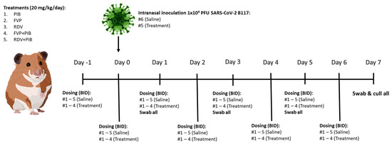Male Syrian golden hamsters (Mesocricetus auratus) were purchased from Janvier Labs (Essex, UK). PIB, FVP, and RDV were purchased from BIOSYNTH LTD (Newbury, UK). An amount of 1 mL regular flocked swabs was obtained from Appleton Woods (Birmingham, UK). Precellys CKmix lysing tubes and a bead mill homogeniser were purchased from Bertin Technologies (Montigny-le-Bretonneux, France) and Fisher Scientific (Waltham, MA, USA), respectively. SARS-CoV-2 (2019-nCoV) CDC qPCR Probe Assay and CDC RUO 2019-nCoV_N_Positive Control were purchased from IDT (Newark, NJ, USA). GoTaq® Probe 1-Step RT-qPCR System and qTOWER3 Real-Time PCR Detector were purchased from Promega (Fitchburg, WI, USA) and Analytik Jena (Jena, Germany), respectively. TRIzol reagent, GlycoBlueTM, PhasemakerTM tubes, Nanodrop, and TURBO DNA-freeTM kits were purchased from Thermo Fisher (Waltham, MA, USA). For immunohistology, the rabbit anti-SARS-CoV nucleoprotein antibody was purchased from Rocklands (Pottstown, PA, USA), the peroxidase blocking buffer and the Envision+System HRP Rabbit from Agilent (Carpinteria, CA, USA), the diaminobenzidine from Agilent DAKO (Carpinteria, CA, USA), and the Tissue-Tek Film for coverslipping from Sysmex (Hyogo, Japan).
