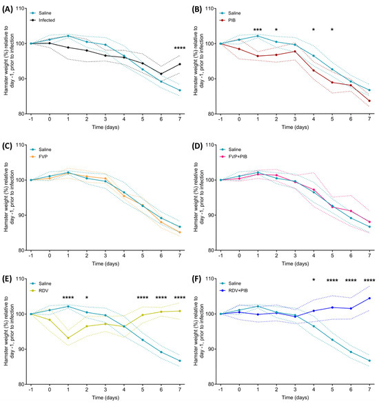 Hamsters from each group (n = 4, except saline n = 5) and infected hamsters (n = 6) were weighed daily from day −1 to day 7 post infection. All weights are shown as a percentage of the initial weight recorded at baseline, day −1 of the study. (A) Saline vs. infected, (B) Saline vs. PIB, (C) Saline vs. FVP, (D) Saline vs. FVP with PIB, (E) Saline vs. RDV, (F) Saline vs. RDV with PIB. Statistical significance was determined by 2-way ANOVA multiple comparison with Bonferroni correction. * = p ≤ 0.05, *** = p ≤ 0.001, **** = p ≤ 0.0001. Dotted lines represent standard deviations.