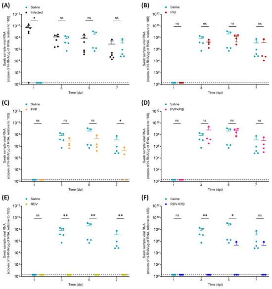 Quantification of SARS-CoV-2 N-RNA in throat swabs taken on day 1, 3, 5, and 7 post intranasal inoculation of the donor (i.e., infected) hamsters. (A) Saline vs. Infected, (B) Saline vs. PIB, (C) Saline vs. FVP, (D) Saline vs. FVP+PIB, (E) Saline vs. RDV, (F) Saline vs. RDV+PIB. To determine statistical significance (p ≤ 0.05), a nonparametric Mann–Whitney test (one-tailed) was performed between the saline control treated group (n = 5) and the infected group (n = 6) or the corresponding chemoprophylaxis-treated group (n = 4) for each day. ns = not statistically significant, * = p ≤ 0.05, ** = p ≤ 0.01. LOD: limit of detection (indicated by dotted line).