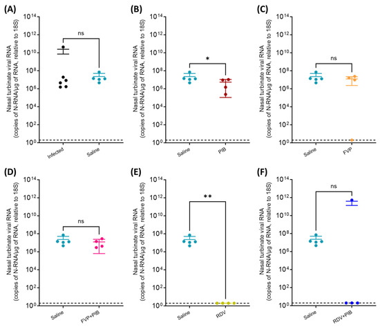 Quantification of SARS-CoV-2 N-RNA in nasal turbinate samples at day 7 post intranasal inoculation of the donor (i.e., infected) hamsters. (A) Saline vs. Infected, (B) Saline vs. PIB, (C) Saline vs. FVP, (D) Saline vs. FVP+PIB, (E) Saline vs. RDV, (F) Saline vs. RDV+PIB. Comparison between saline control group (n = 5) and the infected group (n = 6) or the corresponding chemoprophylaxis-treated group (n = 4) was performed to determine statistical significance (nonparametric Mann–Whitney test [one-tailed], p ≤ 0.05). ns = not statistically significant, * = p ≤ 0.05, ** = p ≤ 0.01. LOD: limit of detection (indicated by dotted line).