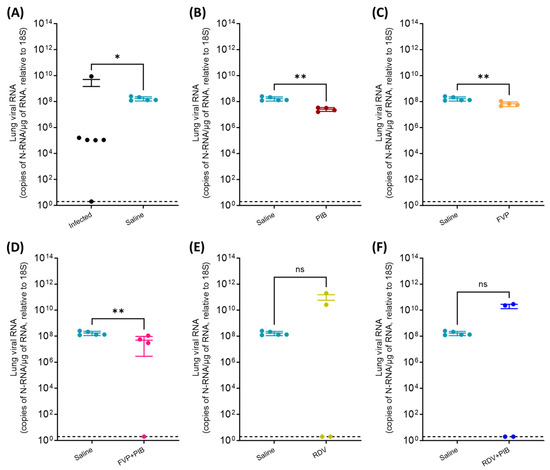 Quantification of SARS-CoV-2 N-RNA in lung samples at day 7 post intranasal inoculation of the donor (i.e., infected) hamsters. Comparison between saline control group (n = 5) and treatment groups (n = 4). (A) Saline vs. Infected, (B) Saline vs. PIB, (C) Saline vs. FVP, (D) Saline vs. FVP+PIB, (E) Saline vs. RDV, (F) Saline vs. RDV+PIB. Statistical significance (p ≤ 0.05) was determined using a nonparametric Mann–Whitney test (one-tailed) between the saline control group (n = 5) and the infected group (n = 6) or the corresponding chemoprophylaxis-treated group (n = 4). ns = not statistically significant, * = p ≤ 0.05, ** = p ≤ 0.01. LOD: limit of detection (indicated by dotted line).