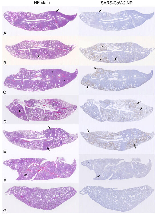The left lungs from each animal were fixed in 10% buffered formalin for 48 h and then stored in 70% ethanol until further processing. Two longitudinal sections were prepared from each lung and routinely paraffin wax embedded. Consecutive sections (3–5 µm) were prepared and stained with haematoxylin eosin (HE) for histological examination or subjected to immunohistological staining to detect SARS-CoV-2 antigen (performed in an autostainer; Agilent), using the horseradish peroxidase (HRP) method and rabbit anti-SARS-CoV nucleocapsid protein (Rockland) as previously described [24,30].