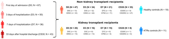 A total of 67 COVID-19 patients with moderate-to-severe disease, defined according to the World Health Organization (WHO) and National Institutes of Health (NIH) guidelines, were enrolled, including 20 KTRs [25,26]. The control group consisted of 19 healthy individuals without any COVID-19 symptoms and with confirmed negative results via both serological and PCR tests. They were matched based on sex and age to maintain comparability. Additionally, another control group included 10 KTRs devoid of COVID-19 symptoms and any contact with the virus. This group was further matched concerning time since transplantation, immunosuppressive therapy, sex, and age. The study design is depicted in Figure 1.