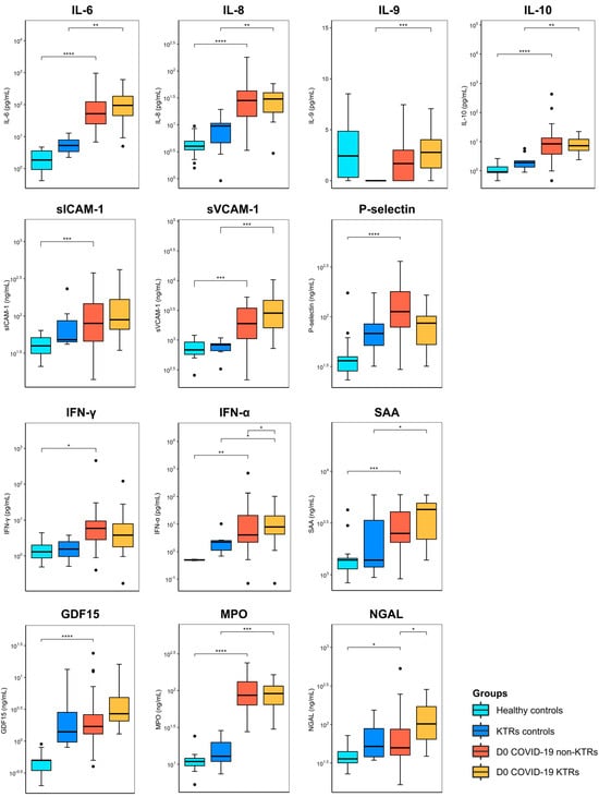 Baseline plasma biomarker levels in patients with COVID-19 stratified by kidney transplant recipient status and respective controls. To investigate potential differences in plasma biomarkers, we employed the Kruskal–Wallis test, followed by Dunn’s test, with Benjamini–Hochberg correction for multiple comparisons. Statistically significant results are denoted by the following symbols: * p < 0.05, ** p < 0.01, *** p < 0.001, and **** p < 0.0001. The outliers are showed as black dots. Abbreviations: IL-6: interleukin 6. IL-8: interleukin 8. IL-9: interleukin 9. IL-10: interleukin 10. sICAM-1: soluble intercellular adhesion molecule 1. sVCAM-1: soluble circulating vascular cell adhesion molecule 1. IFN-γ: interferon gamma. IFN-α: interferon alpha. SAA: serum amyloid A. GDF-15: growth/differentiation factor 15. MPO: myeloperoxidase. NGAL: neutrophil gelatinase-associated lipocalin. D0 (day 0): blood samples were collected at admission. KTRs: kidney transplant recipients. Non-KTRs: non-kidney transplant recipients.