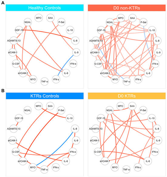 Correlation-based network analysis. (A) Non-kidney transplant recipient networks and (B) kidney transplant recipient networks. The links displayed in these networks indicate statistically significant Spearman’s rank correlations (p < 0.05). Specifically, red links represent positive correlations (rho ≥ 0.20), while blue links represent negative correlations (rho ≤ 0.20). Abbreviations: IL-6: interleukin 6. IL-8: interleukin 8. IL-9: interleukin 9. IL-10: interleukin 10. G-CSF: granulocyte colony-stimulating factor. TNF-α: tumor necrosis factor alpha. IFN-α: interferon alpha. IFN-γ: interferon gamma. GDF-15: growth/differentiation factor 15. sICAM-1: soluble intercellular adhesion molecule 1. MPO: myeloperoxidase. NGAL: neutrophil gelatinase-associated lipocalin. sVCAM-1: soluble circulating vascular cell adhesion molecule 1. SAA: serum amyloid A. MYO: myoglobin. P-Sel: P-selectin. D0 (day 0): blood samples were collected at admission. KTRs: kidney transplant recipients. Non-KTRs: non-kidney transplant recipients.