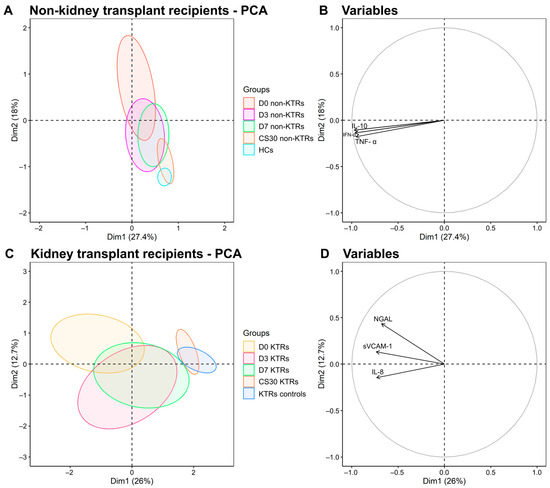 Principal component analysis (PCA) of plasma biomarkers. (A) Non-kidney transplant recipient PCA: percentage of explained variance in principal components 1 and 2. (B) Contribution of variables (non-kidney transplant recipients): top 3 variables explaining variance in the data. (C) Kidney transplant recipient PCA: percentage of explained variance in principal components 1 and 2. (D) Contribution of variables (kidney transplant recipients): top 3 variables explaining variance in the data. The ellipse indicates the central 33% of the data points, representing the grouping of the samples. The arrows denote the direction (arrow orientation) and strength (arrow length) of the correlation between each biomarker and the principal components. Abbreviations: IL-10: interleukin 10. IFN-α: interferon alpha. TNF-α: tumor necrosis factor alpha. NGAL: neutrophil gelatinase-associated lipocalin. sVCAM-1: soluble circulating vascular cell adhesion molecule 1. IL-8: interleukin 8. KTRs: kidney transplant recipients. Non-KTRs: non-kidney transplant recipients. HCs: healthy controls.