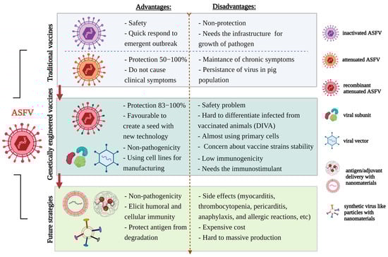 Overview of the strategies for ASF vaccine development. Conventional vaccines and currently used vaccines pose safety and efficacy problems. The application of nanomaterials may help improve the efficacy of non-pathogenic vaccines. This figure was created with BioRender.com.