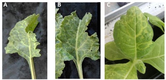 - Sabokkhiz, M.A.; Jafarpour, B.; Shahriari Ahmadi, F.; Tarighi, S.I. dentification of Turnip mosaic virus isolated from Canola in northeast area of Iran. Afr. J. Biotechnol. 2012, 11, 14553–14560. [Google Scholar]